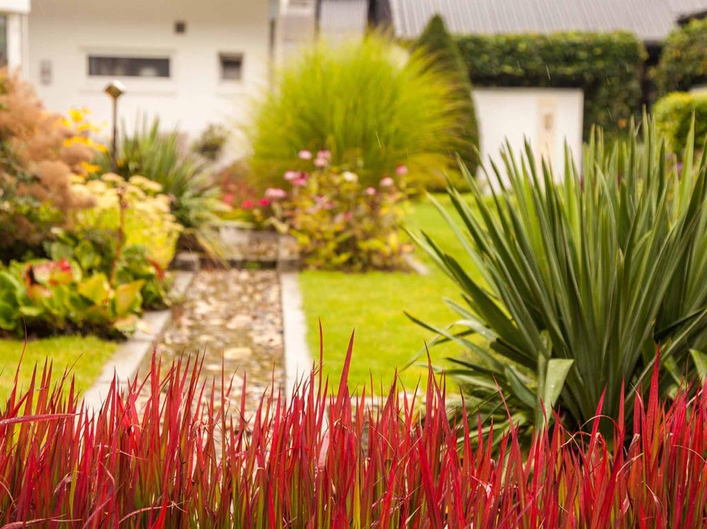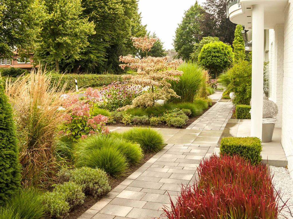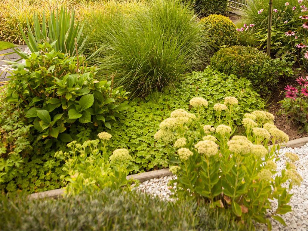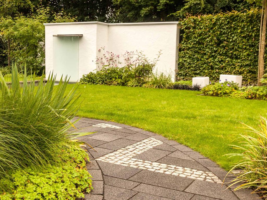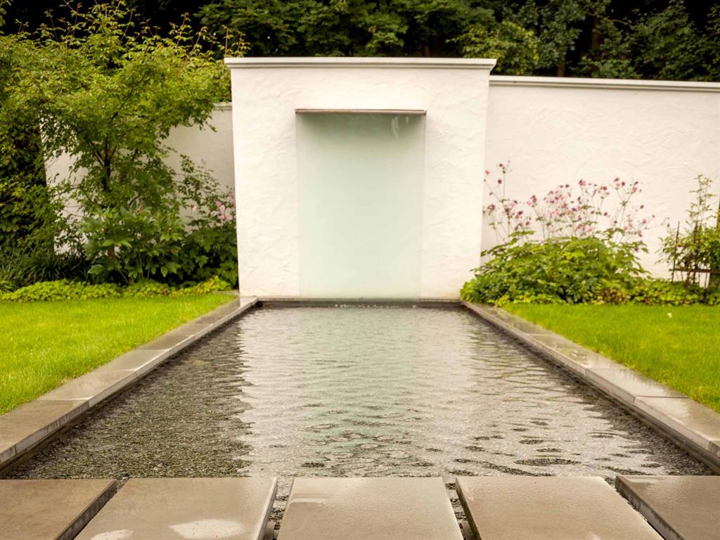 Ein Garten mit üppiger Staudenpflanzung und einem abwechslungsreichen Materialmix bei der Gestaltung der Wege und Terrassen.Formales Wasserbecken mit Wasserfall und Trittplatten.
