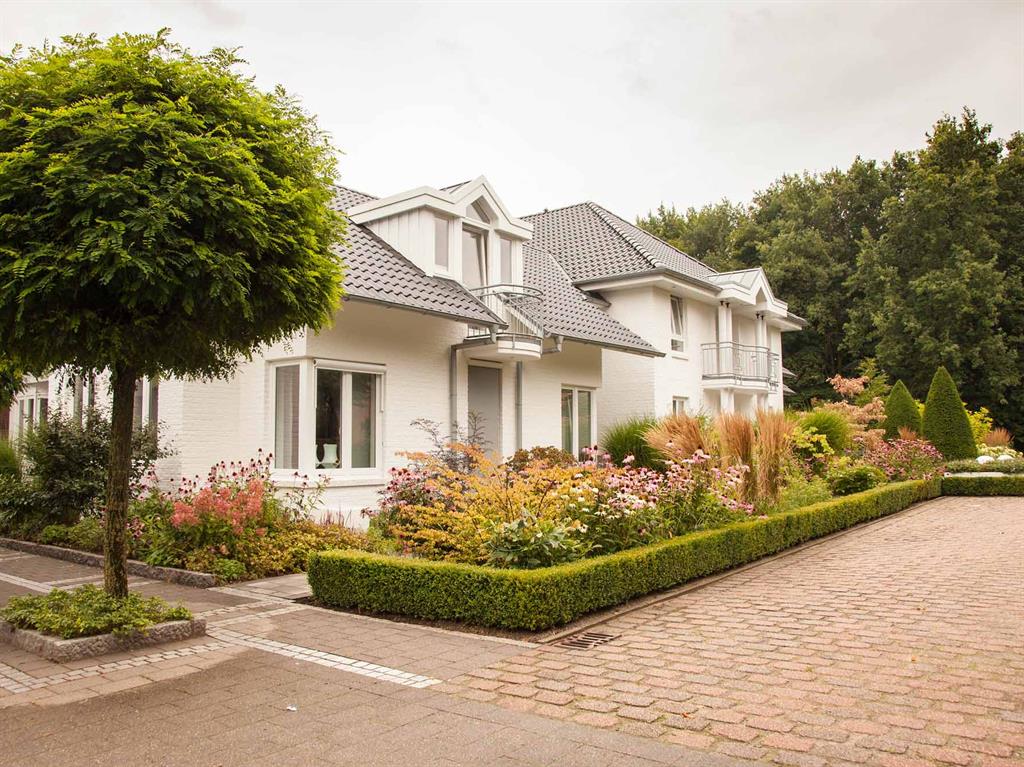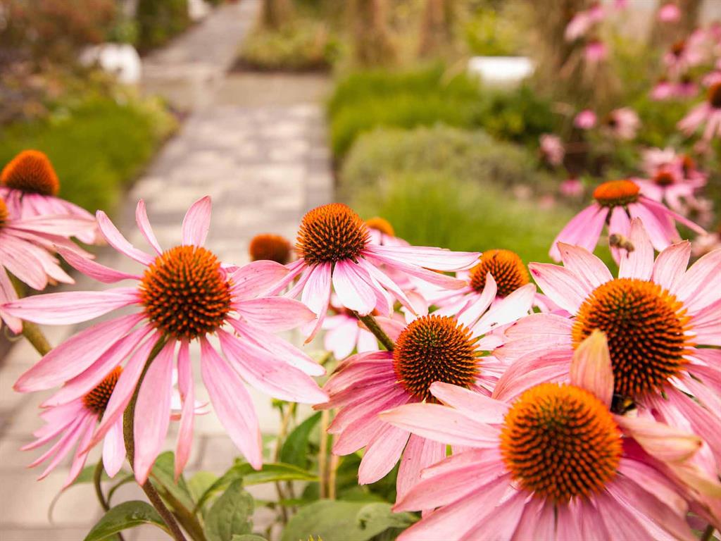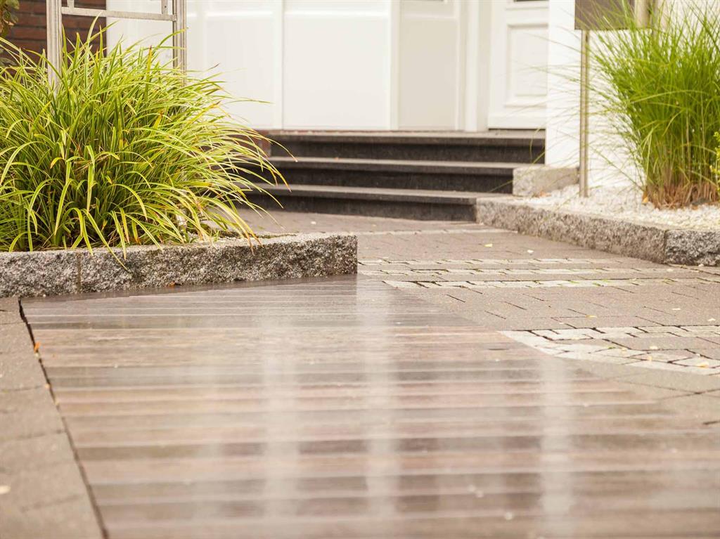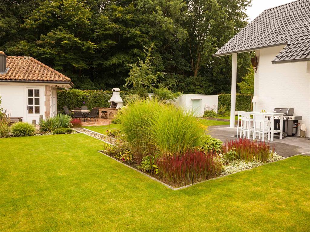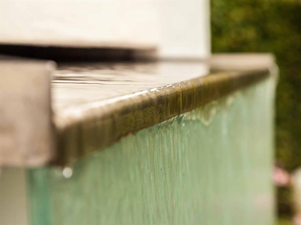 Ein Garten mit üppiger Staudenpflanzung und einem abwechslungsreichen Materialmix bei der Gestaltung der Wege und Terrassen.Formales Wasserbecken mit Wasserfall und Trittplatten.