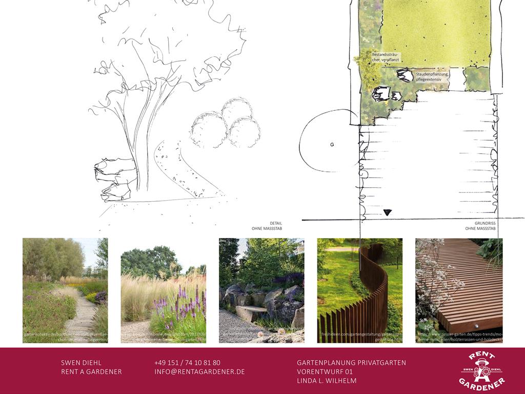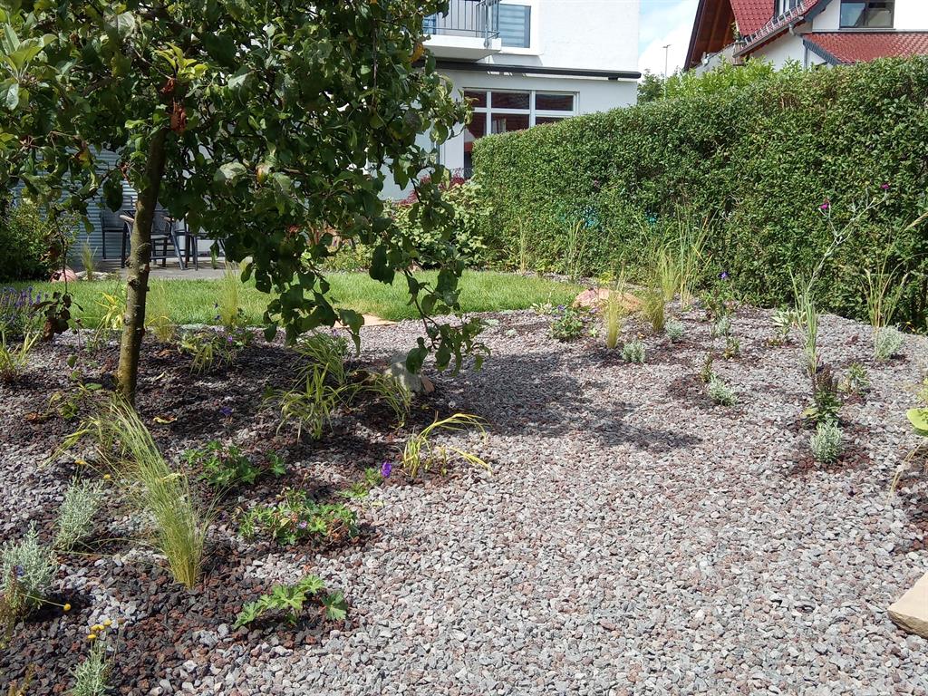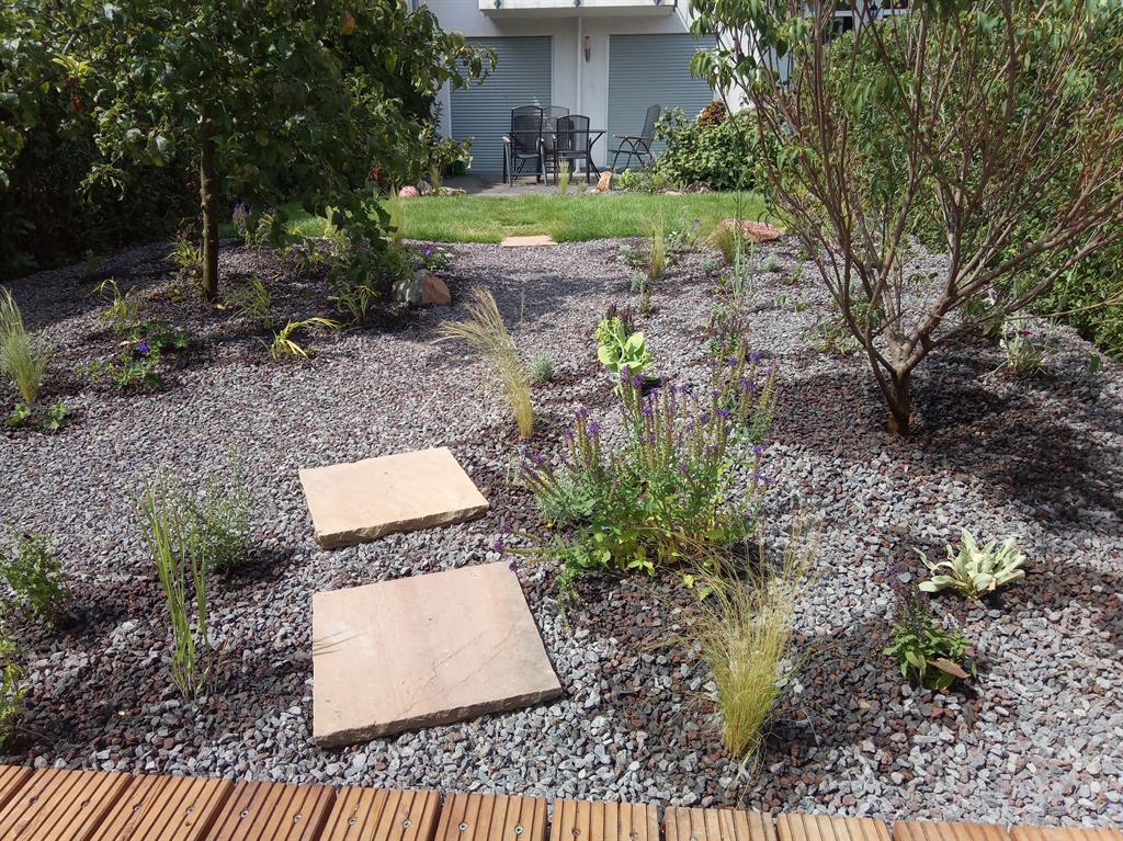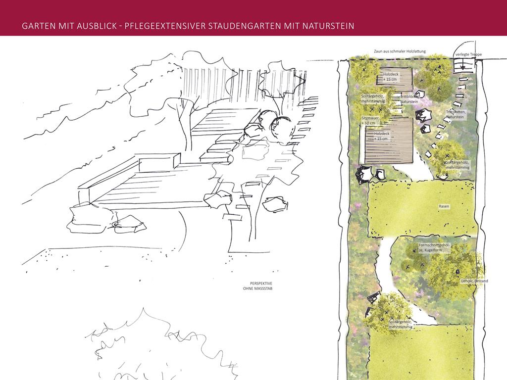 Für den schmalen Reihenhausgarten wurde ein stimmiges Gesamtkonzept entwickelt. Der Bauherr wünschte sich einen Sitzplatz im Garten, eine pflegeextensive Pflanzung sowie ein ansprechendes Gesamtbild.Durch Staudenmischungen, welche nur wenige Pflegegänge im Jahr benötigen, kann die Erholung im Garten in den Vordergrund treten. Mehrstämmige kleinbleibende Gehölze sowie Gräser- und Staudenbänder setzen Akzente und unterteilen den Garten in unterschiedliche Räume. Der Garten gewinnt so optisch an Größe und wird gleichzeitig vielfältiger nutzbar.