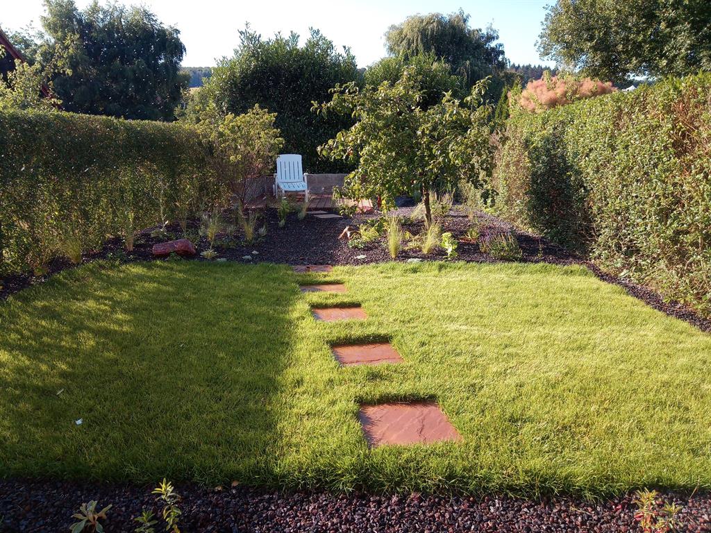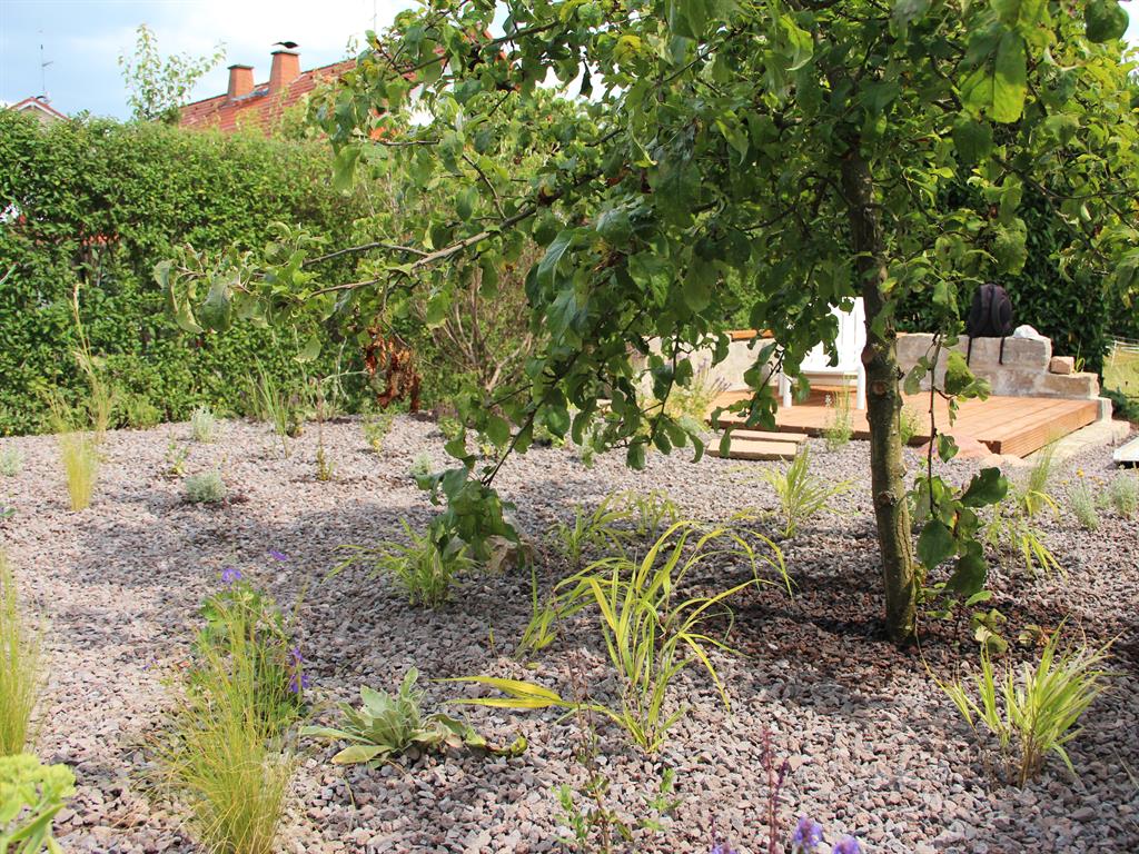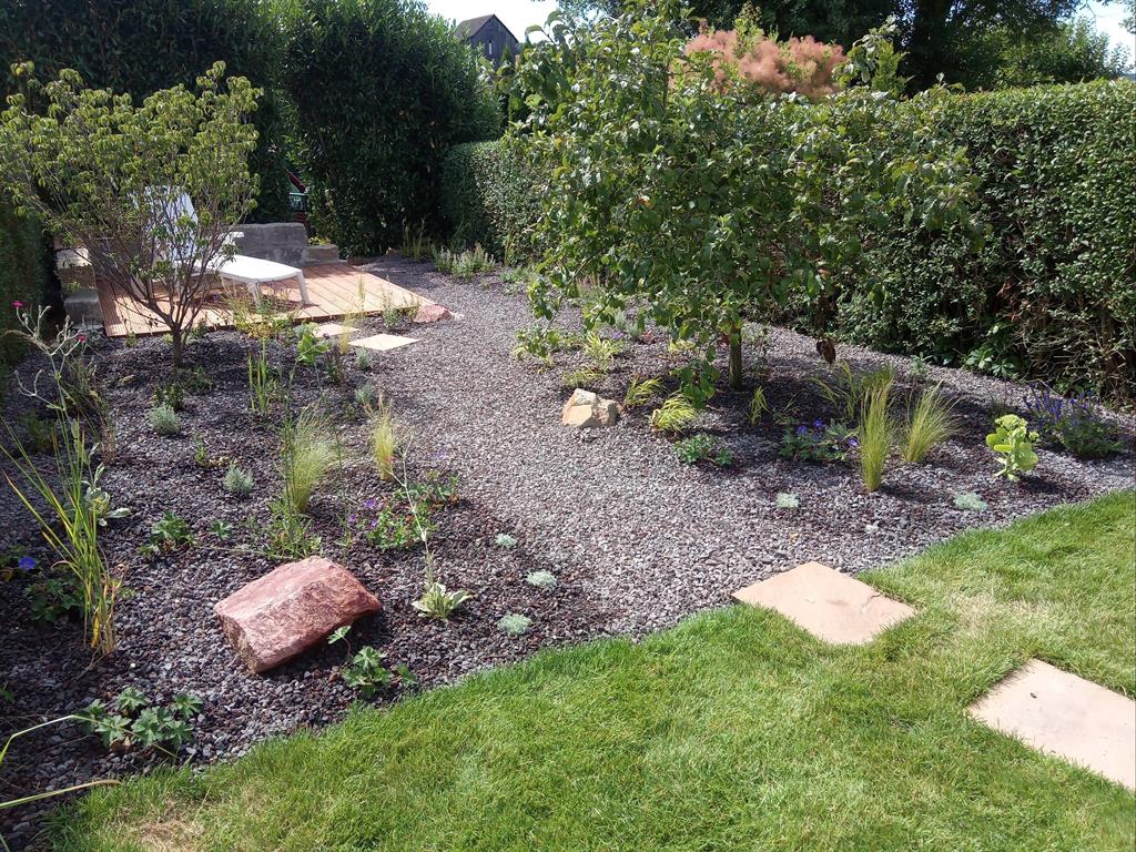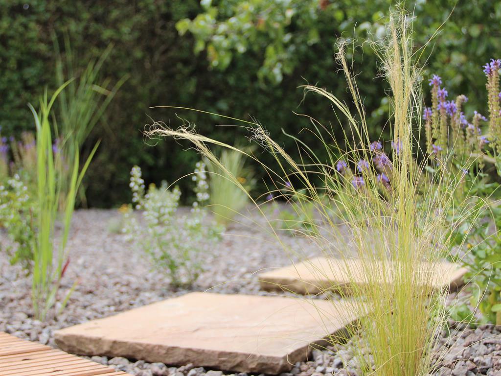 Für den schmalen Reihenhausgarten wurde ein stimmiges Gesamtkonzept entwickelt. Der Bauherr wünschte sich einen Sitzplatz im Garten, eine pflegeextensive Pflanzung sowie ein ansprechendes Gesamtbild.Durch Staudenmischungen, welche nur wenige Pflegegänge im Jahr benötigen, kann die Erholung im Garten in den Vordergrund treten. Mehrstämmige kleinbleibende Gehölze sowie Gräser- und Staudenbänder setzen Akzente und unterteilen den Garten in unterschiedliche Räume. Der Garten gewinnt so optisch an Größe und wird gleichzeitig vielfältiger nutzbar.