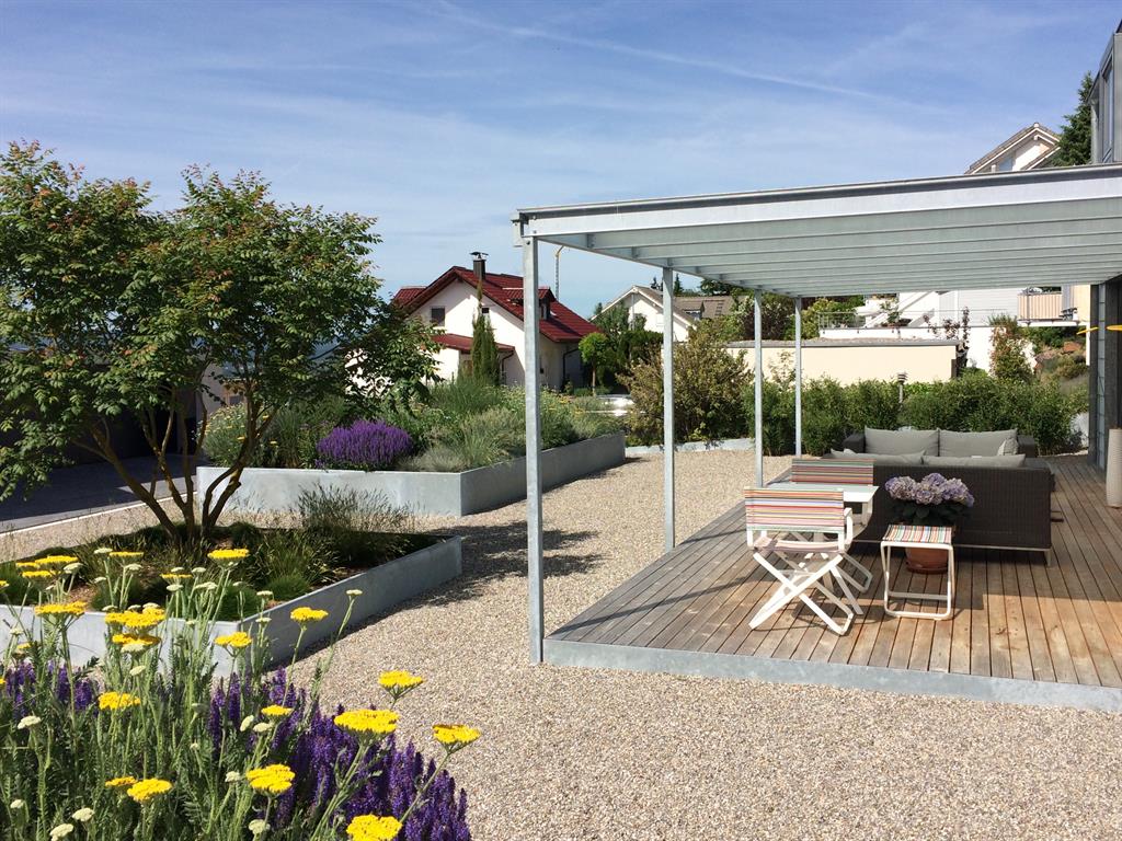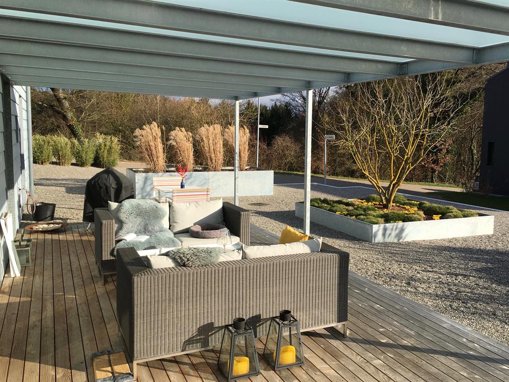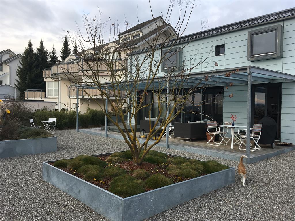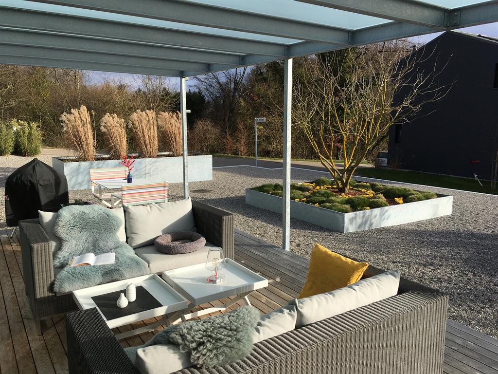 Die überdachte Terrasse mit gemütlicher Lounge und Whirlpool lädt zum Relaxen und Erholen ein. Von dort kann man die ansprechende Bepflanzung der Hochbeete genießen, die das ganze Jahr über einen attraktiven Blickfang bildet. Auf der Rückseite des Hauses kann man an heißen Sommertagen im Schatten des Baumes verweilen. Die Materialien sind sehr modern und formal gehalten.