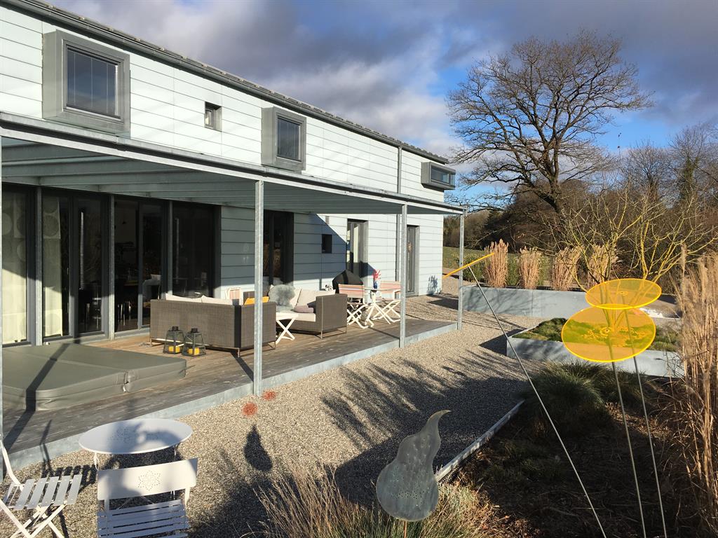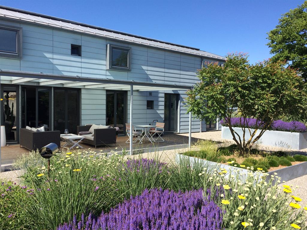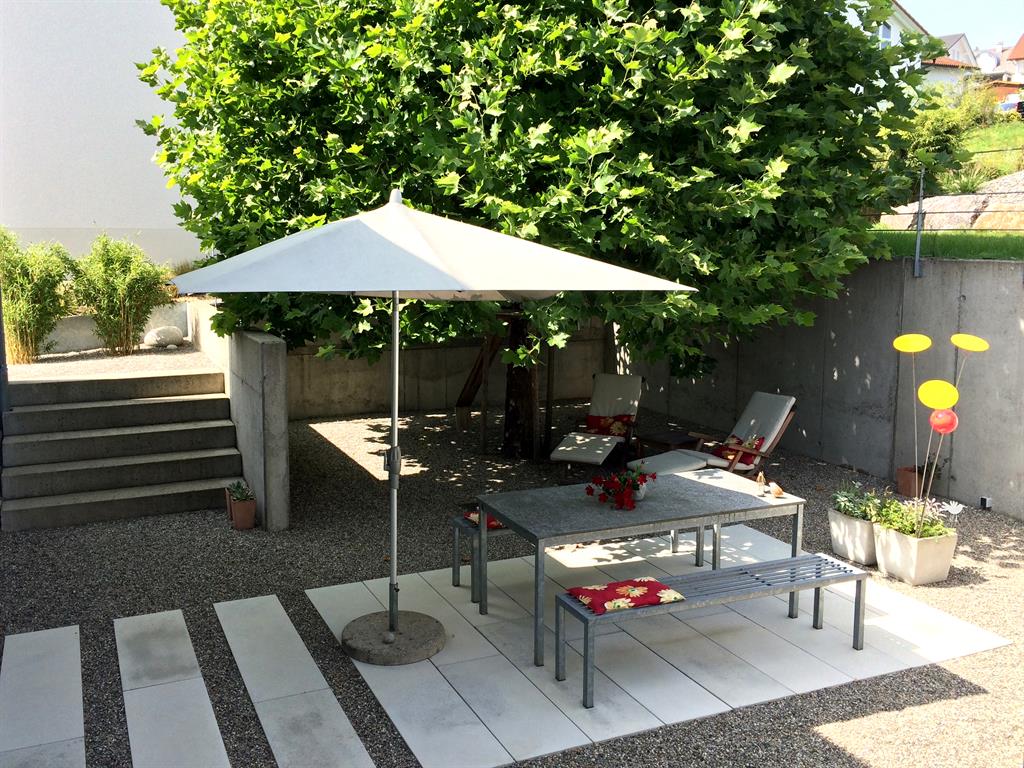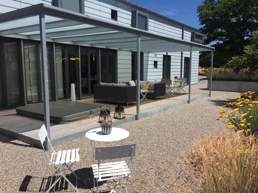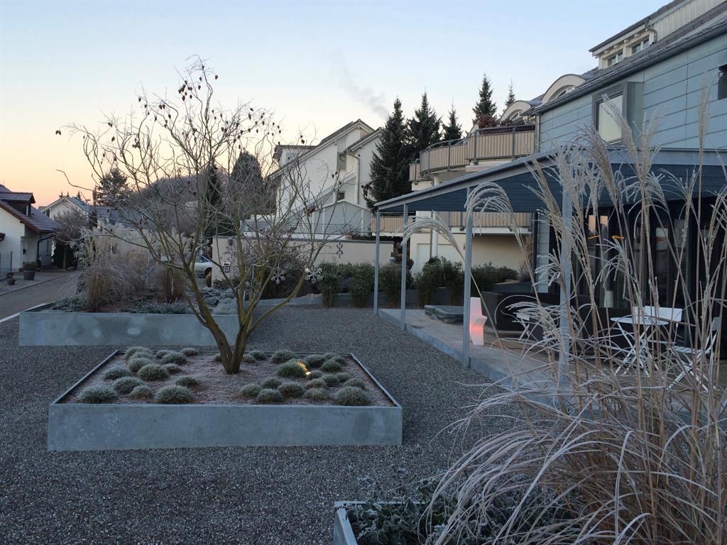 Die überdachte Terrasse mit gemütlicher Lounge und Whirlpool lädt zum Relaxen und Erholen ein. Von dort kann man die ansprechende Bepflanzung der Hochbeete genießen, die das ganze Jahr über einen attraktiven Blickfang bildet. Auf der Rückseite des Hauses kann man an heißen Sommertagen im Schatten des Baumes verweilen. Die Materialien sind sehr modern und formal gehalten.