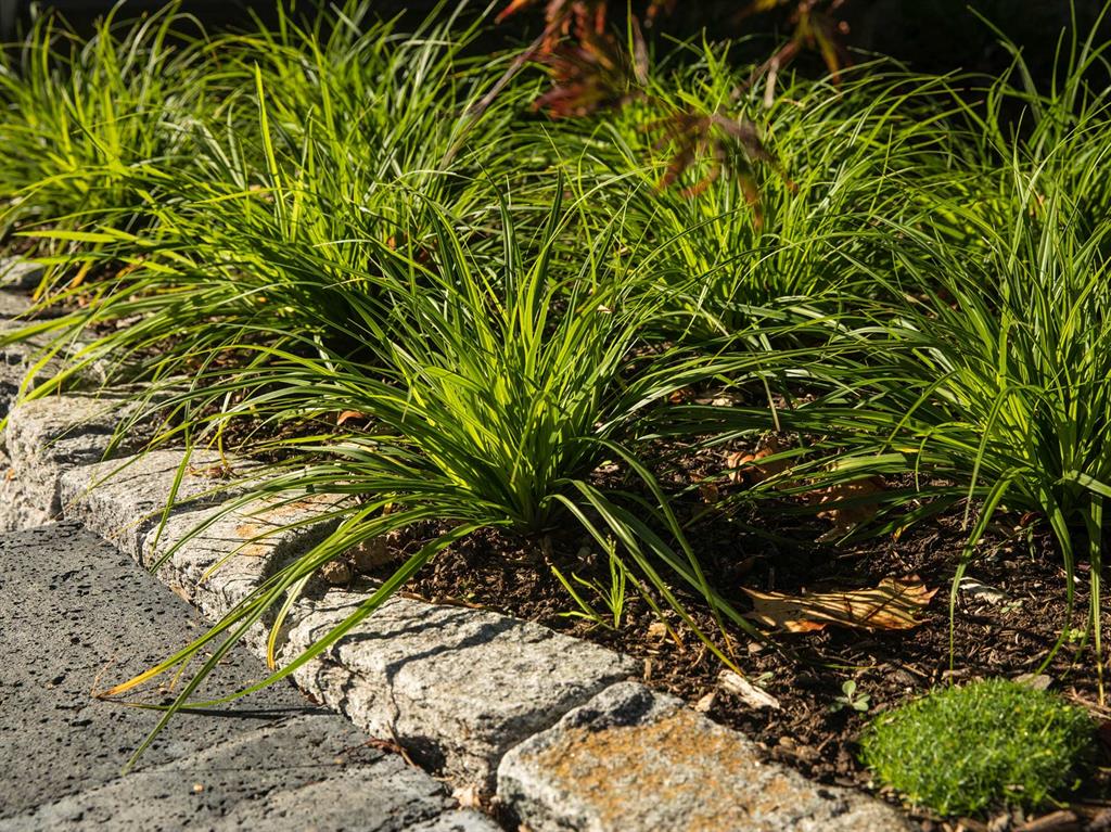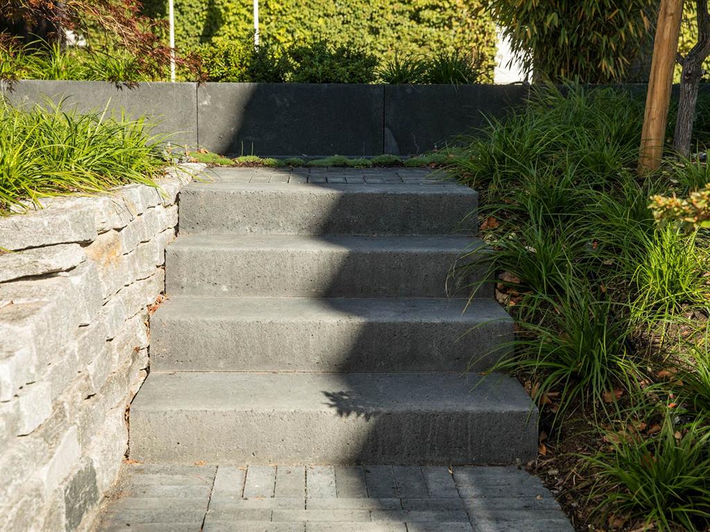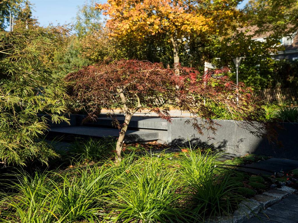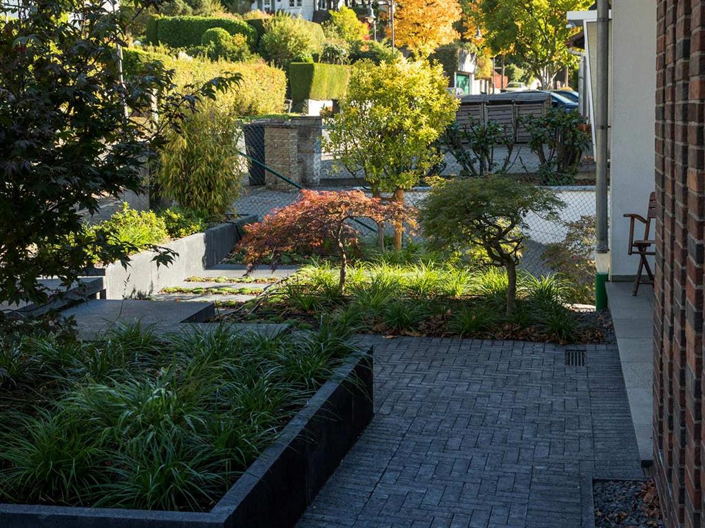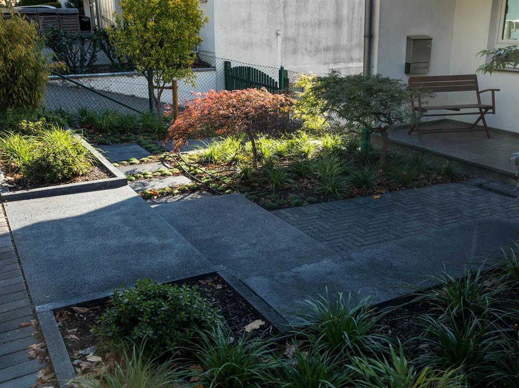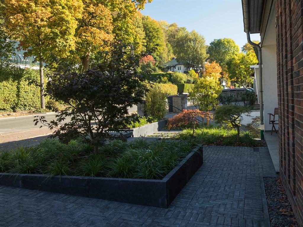 Architektonischer Vorgarten in WuppertalImmer wieder halten Fußgänger und Radfahrer und erkundigen sich nach dem neuen Vorgarten. Der verwendete holländische Betonstein fällt auf und weckt das Interesse der Vorbeifahrenden. Gerade Linienführung, großformatige Betonplatten und Farbkontraste schaffen einen offenen und einladenden Vorgarten. Durch die Reduktion auf das Wesentliche kommt der eigentliche Hauseingang besonders zur Geltung, der Vorgarten wirkt repräsentativ und ist darüber hinaus auch noch pflegeleicht. Bei der Gestaltung dieses Vorgartens spielen schwebende Stufen und kontrastreiche Bepflanzung eine zentrale Rolle. Hier haben wir die schwebenden Stufen, kleinere Hangabstützungen, Blockstufen und Pflasterflächen aus dem besonderen holländischen Beton verwendet. Die Farbe „Carbon“ passte perfekt zu unseren Vorstellungen der Farbkombination. Größere Höhenunterschiede wurden mit Bruchsteinmauerwerk aus Eifelgneis abgefangen. Als Highlights innerhalb der Gräserfläche wurden einzelne, deutlich größere Japan-Waldgräser gepflanzt. Als Highlight für das zentrale Pflanzbeet haben wir einen weiteren japanischen Ahorn bei der naheliegenden Baumschule ausgesucht.