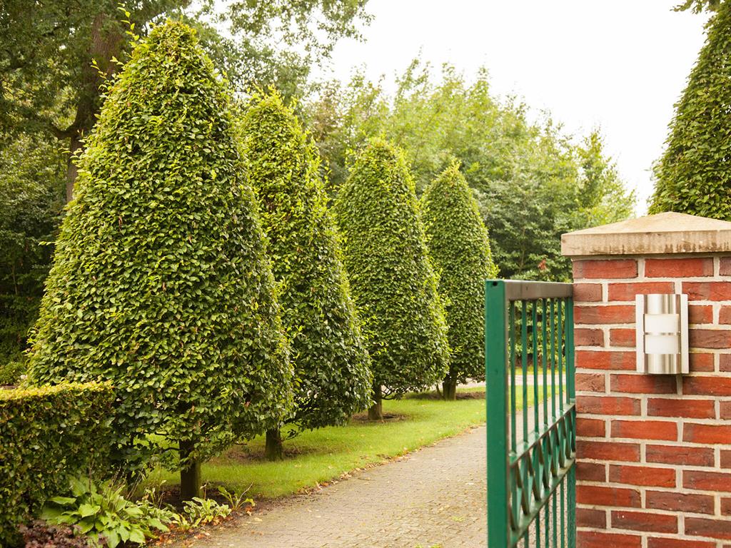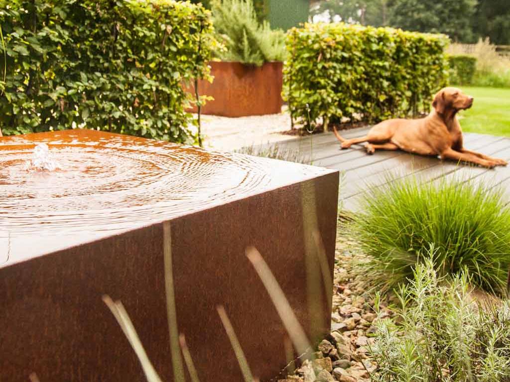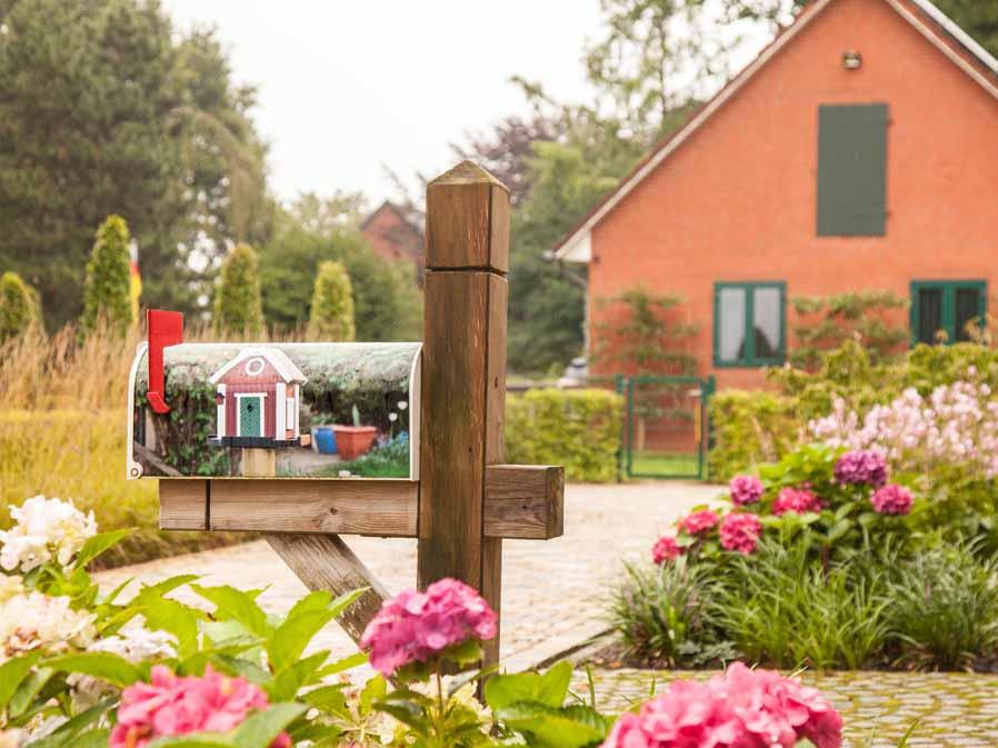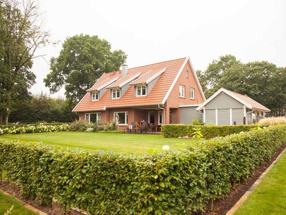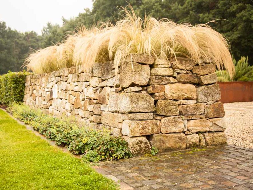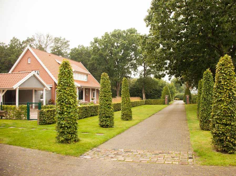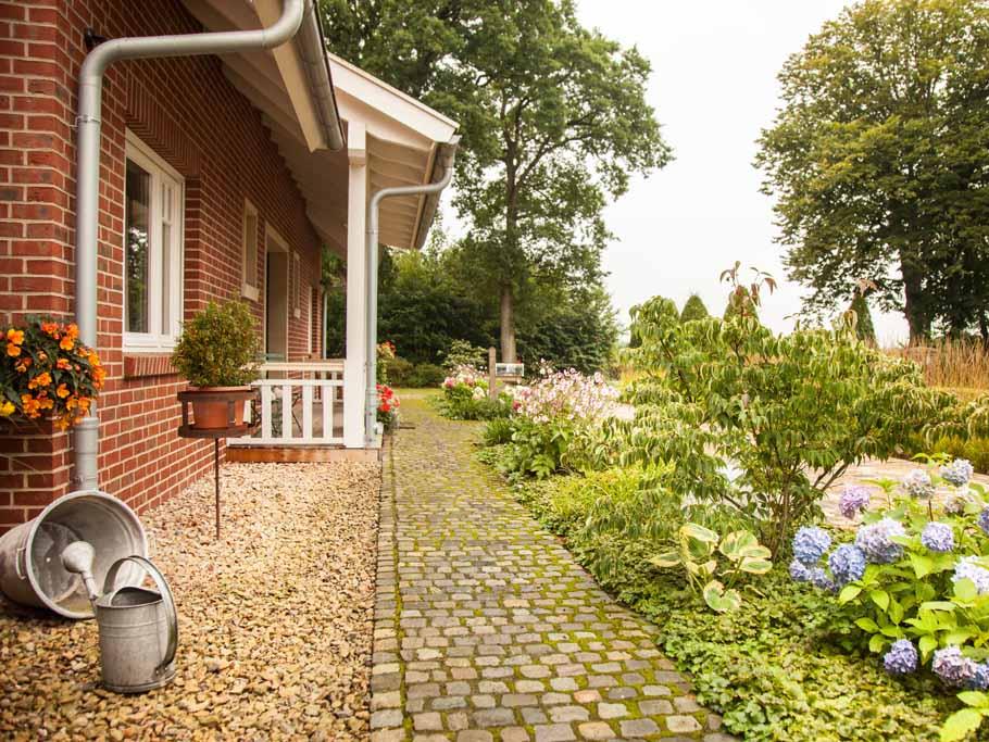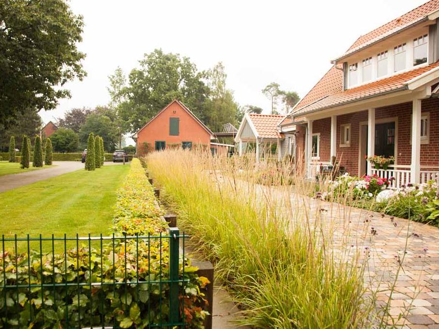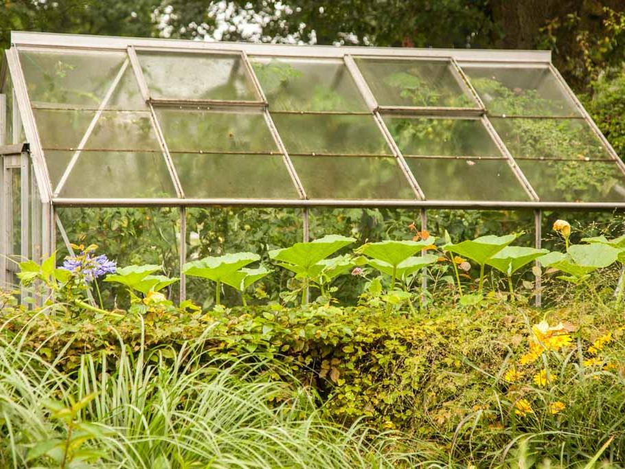Garten für eine Familie mit Gewächshaus, Gemüsebeet, Staudenpflanzung, Kleinsteinpflaster und Hochbeeten aus Naturstein.
