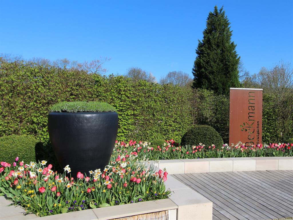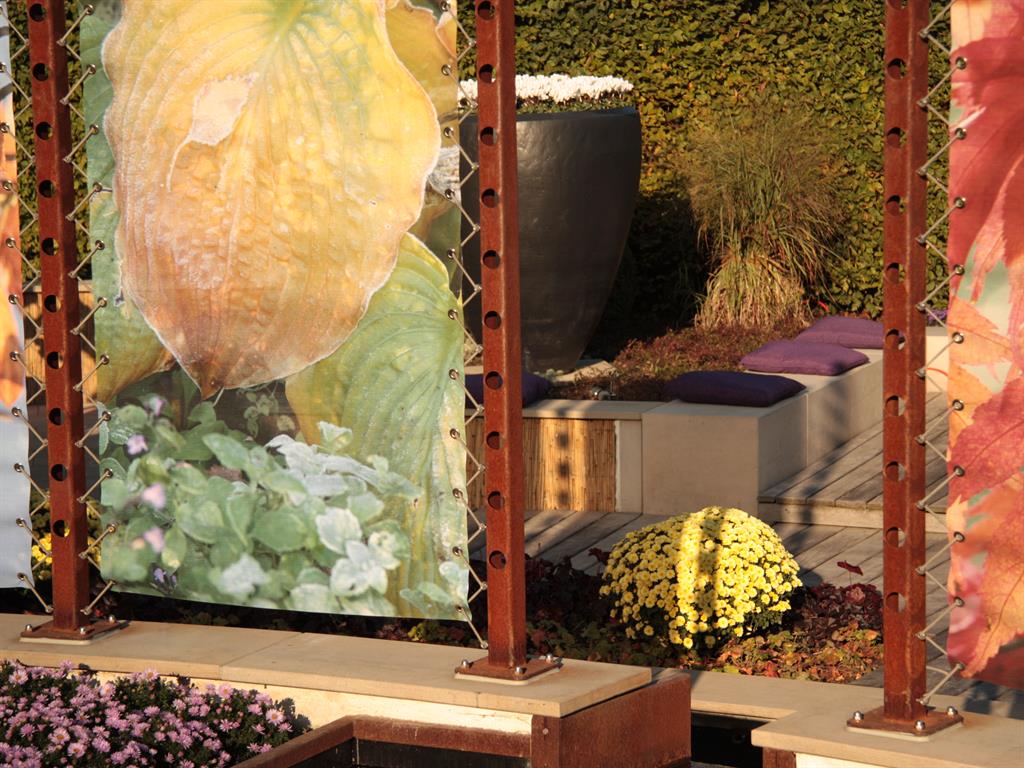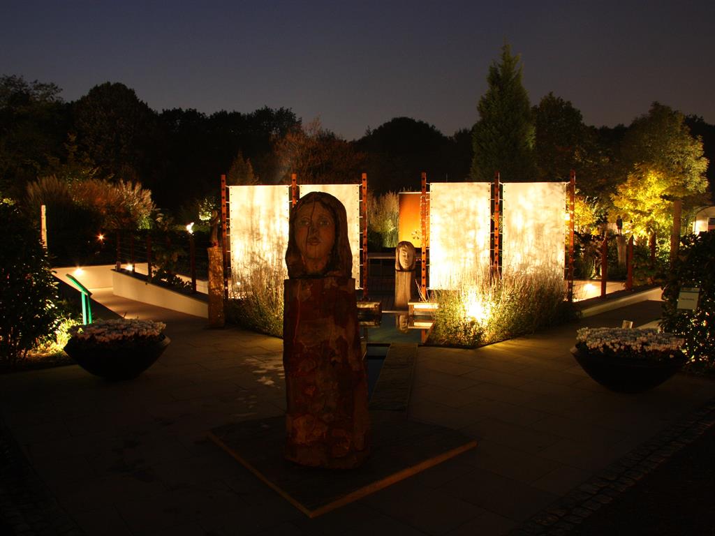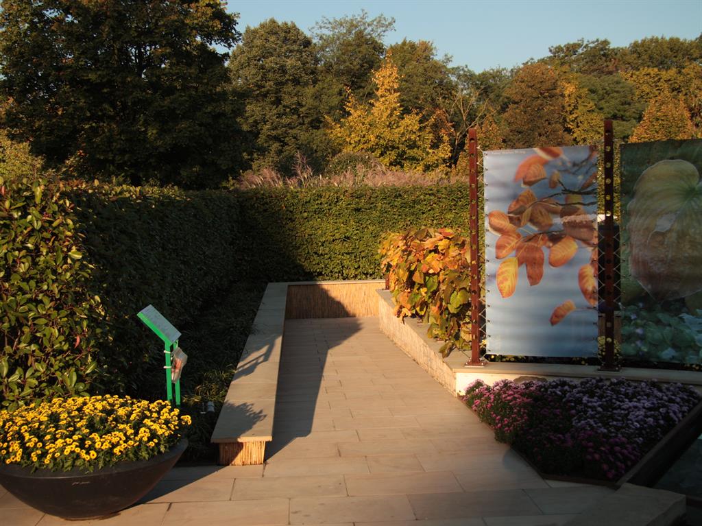 Ein geradlinig gefasster Garten, der zum Ankommen, Verweilen und Genießen einlädt. Seine Wirkung signalisiert nach außen Abgeschiedenheit, nach innen angenehme Ruhe. Gewohnte Alltagsgeräusche werden überspielt durch das leichte Plätschern des Wassers, das Auge findet neben der ruhiggehaltenen Bauwerksatmosphäre Abwechslung in den jahreszeitlichen Veränderungsmöglichkeiten der Pflanzflächen. Der innenhofartige Raum lässt sich barrierefrei auf der einen, über eine Treppe auf der anderen Seite erreichen. Fühlen Sie sich herzlich eingeladen, diesen an mediterrane Innenhöfe erinnernden Raum zu erkunden und in sich aufzunehmen. Sie werden einen Ort finden, der Bedürfnisse nach zwischenmenschlicher Begegnung und Entspannung weckt. Einen Ort mit Identität. Ein Sinnbild für das Leben, für ästhetische Komposition und gärtnerische Leidenschaft.
