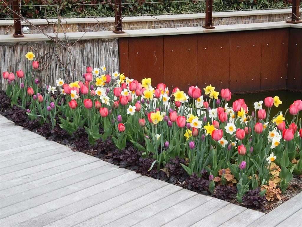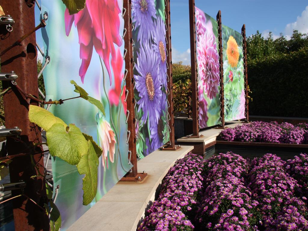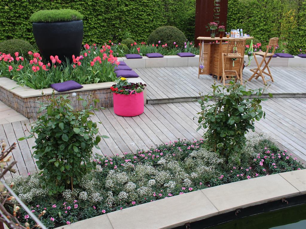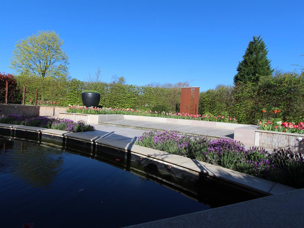 Ein geradlinig gefasster Garten, der zum Ankommen, Verweilen und Genießen einlädt. Seine Wirkung signalisiert nach außen Abgeschiedenheit, nach innen angenehme Ruhe. Gewohnte Alltagsgeräusche werden überspielt durch das leichte Plätschern des Wassers, das Auge findet neben der ruhiggehaltenen Bauwerksatmosphäre Abwechslung in den jahreszeitlichen Veränderungsmöglichkeiten der Pflanzflächen. Der innenhofartige Raum lässt sich barrierefrei auf der einen, über eine Treppe auf der anderen Seite erreichen. Fühlen Sie sich herzlich eingeladen, diesen an mediterrane Innenhöfe erinnernden Raum zu erkunden und in sich aufzunehmen. Sie werden einen Ort finden, der Bedürfnisse nach zwischenmenschlicher Begegnung und Entspannung weckt. Einen Ort mit Identität. Ein Sinnbild für das Leben, für ästhetische Komposition und gärtnerische Leidenschaft.