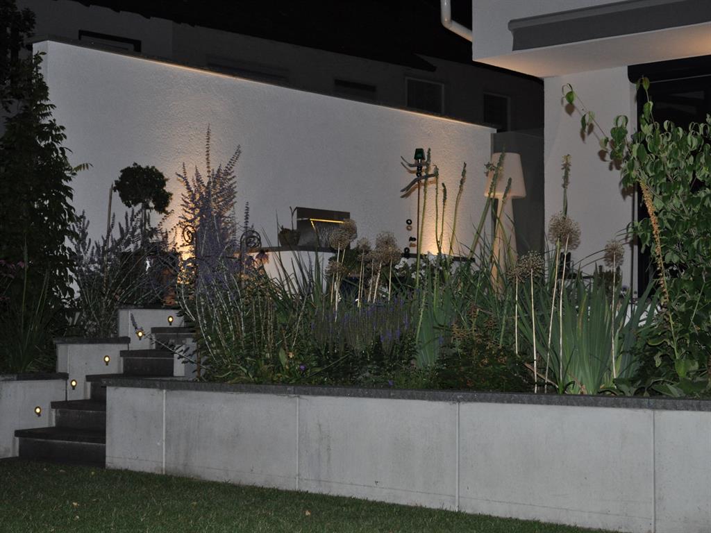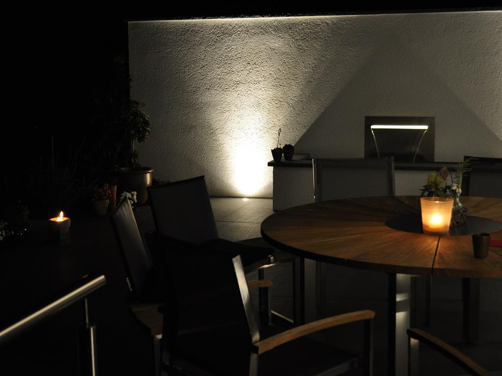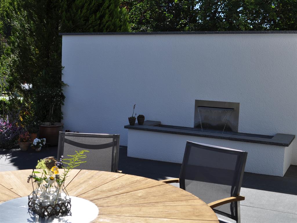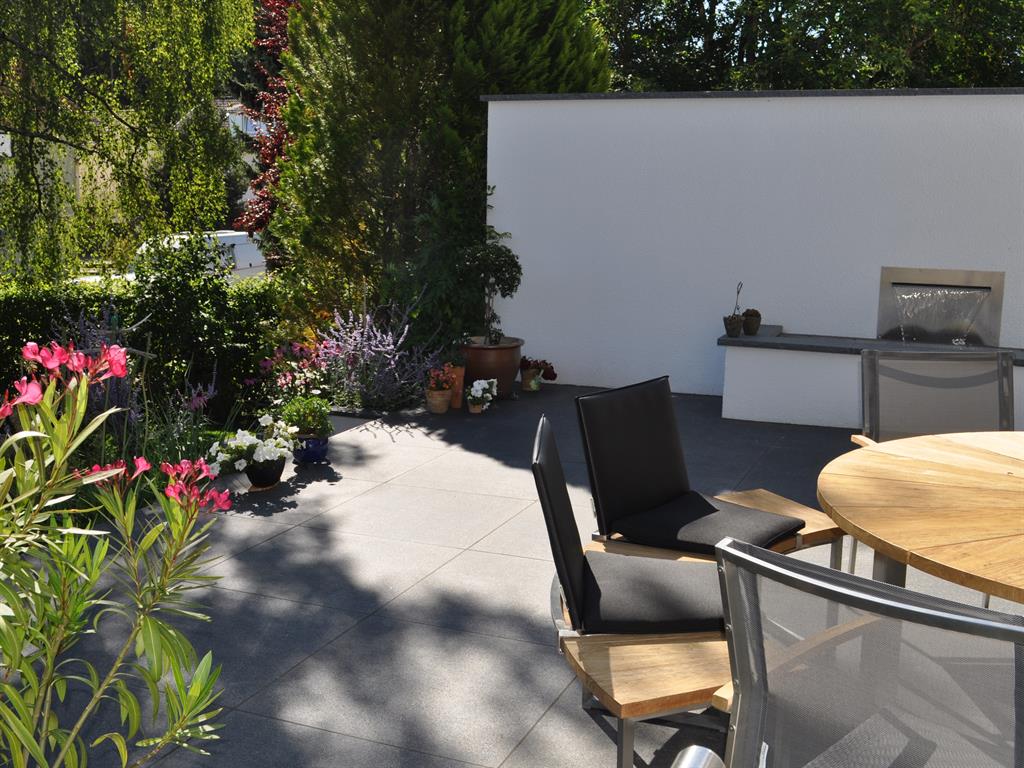 Vor der Gartensanierung wurde der Garten so gut wie nicht genutzt. Er hatte ja auch nichts was zum Verweilen einlud. Heute genießt die Familie jede freie Minute auf der großen Terrasse im Freien. Und wenn abends der Garten noch entsprechend illuminiert wird ist das eine wirkliches Plus an Lebensqualität. Der schlichte Brunnen bietet dabei einen besonderen Blickfang. Am runden Tisch kann man im Gespräch mit Freunden und der Familie den Alltag hinter sich lassen und neue Energie tanken.
