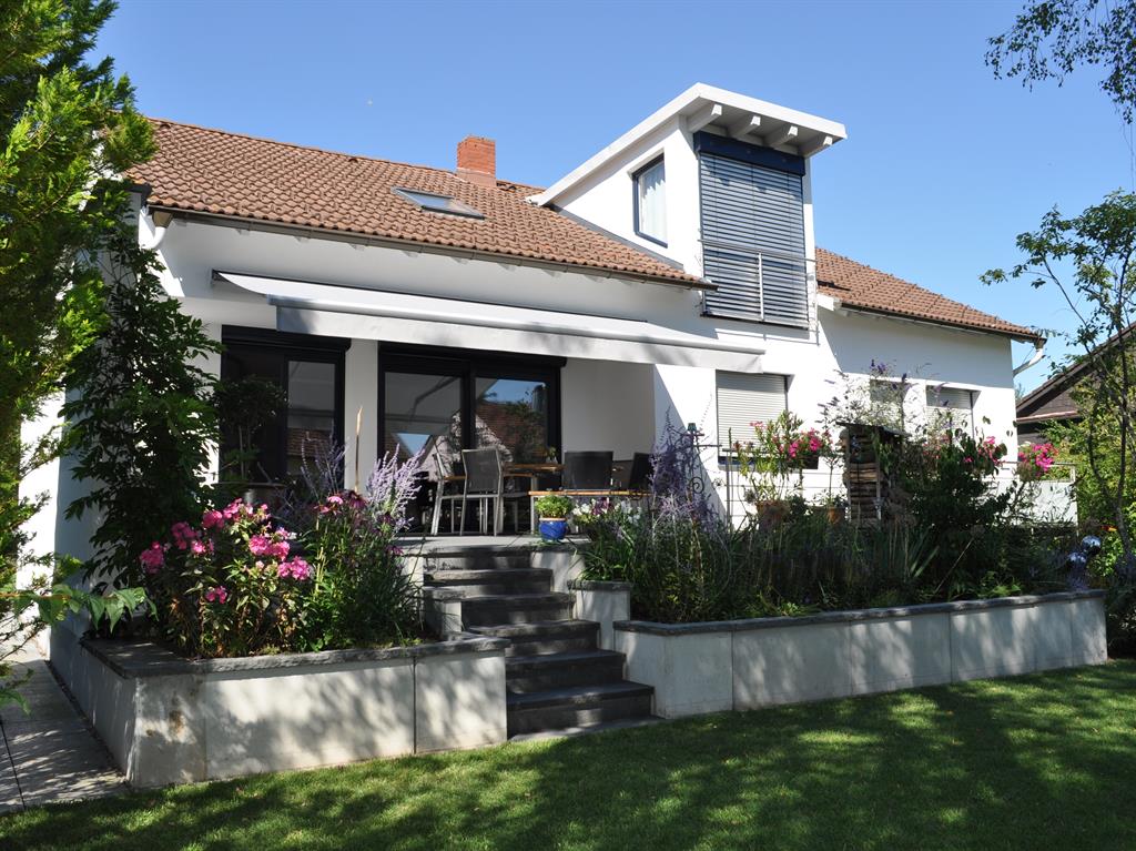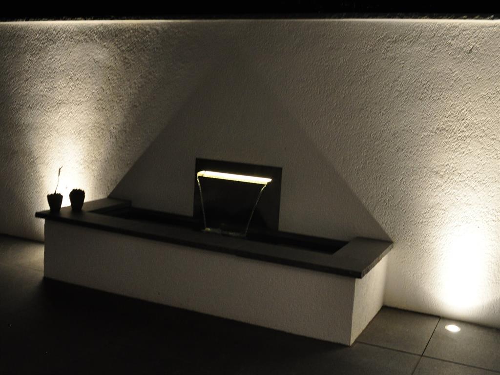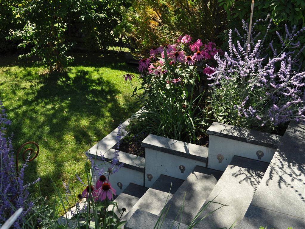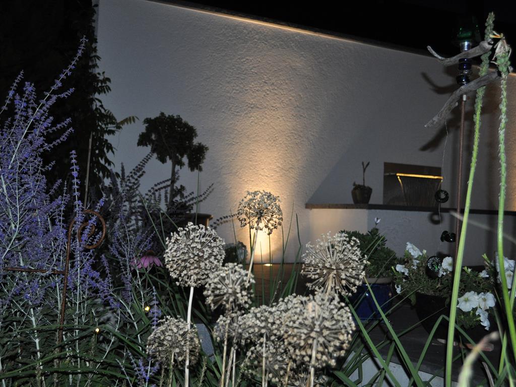 Vor der Gartensanierung wurde der Garten so gut wie nicht genutzt. Er hatte ja auch nichts was zum Verweilen einlud. Heute genießt die Familie jede freie Minute auf der großen Terrasse im Freien. Und wenn abends der Garten noch entsprechend illuminiert wird ist das eine wirkliches Plus an Lebensqualität. Der schlichte Brunnen bietet dabei einen besonderen Blickfang. Am runden Tisch kann man im Gespräch mit Freunden und der Familie den Alltag hinter sich lassen und neue Energie tanken.