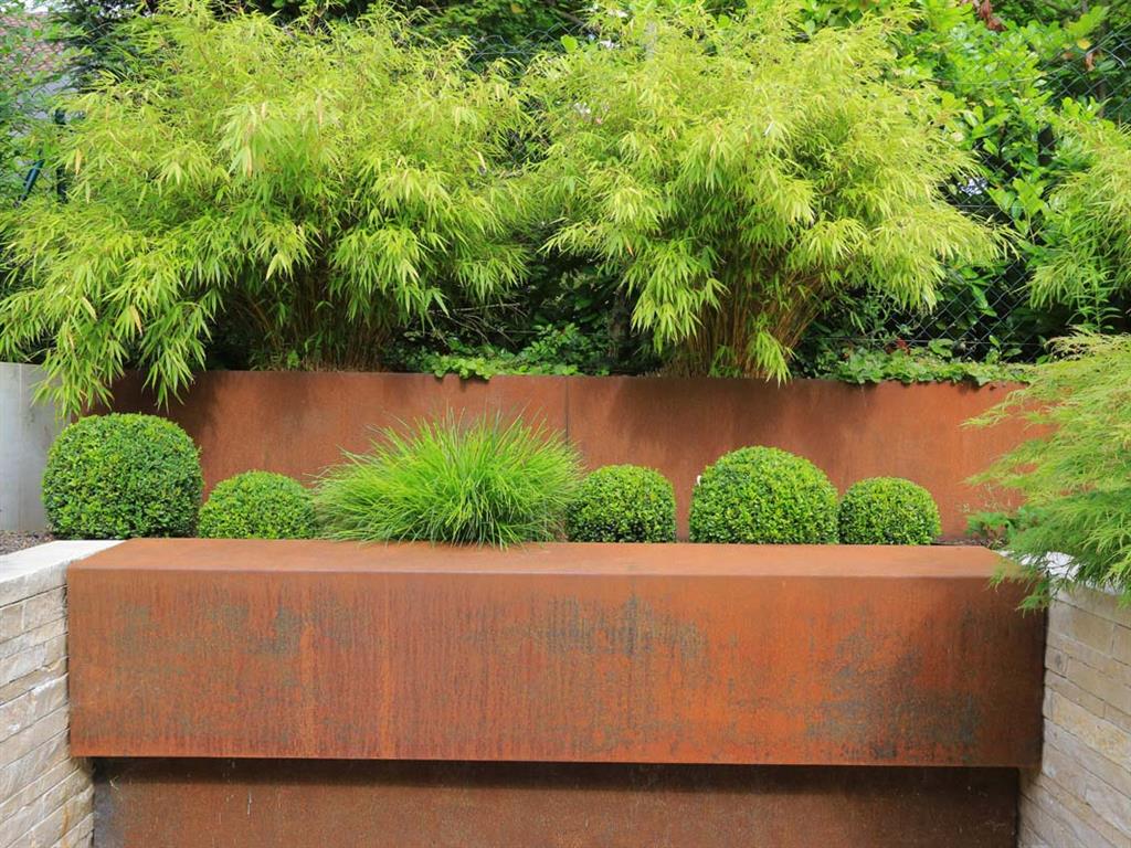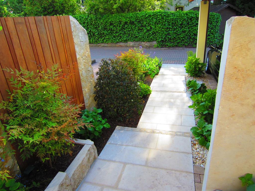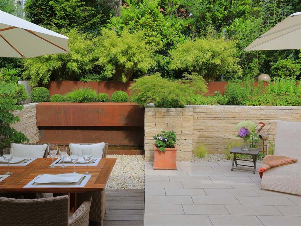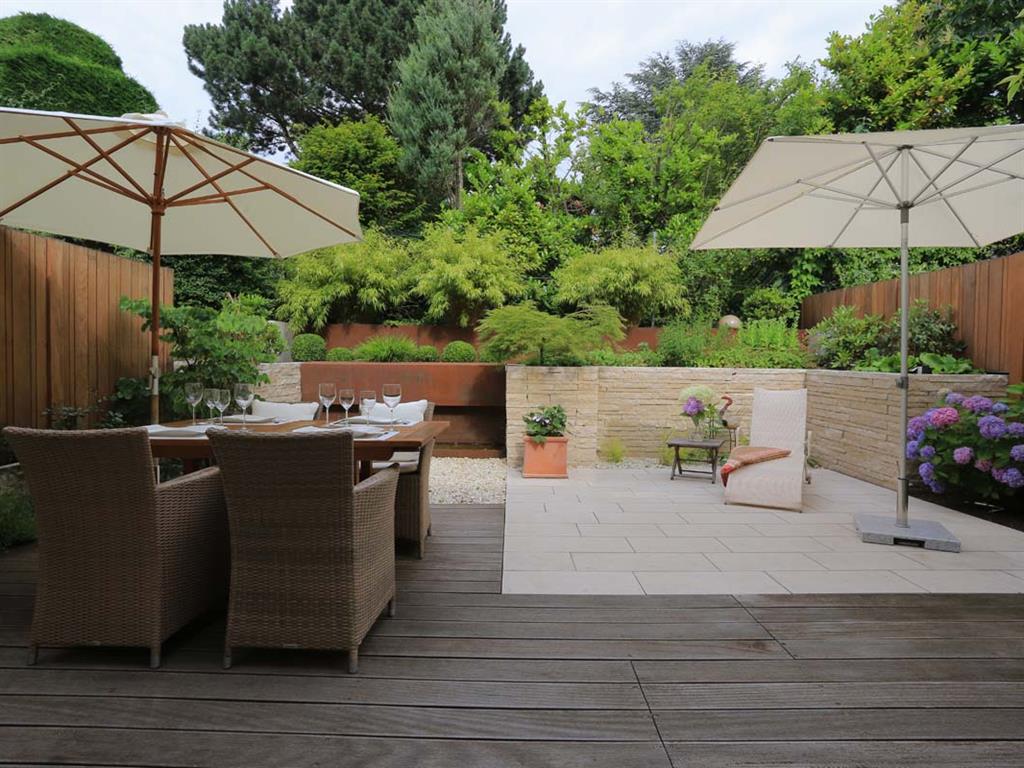 Vorgarten: Neugestaltung des Süd-orientierten Eingangsbereichs mit 2 Stellplätzen, Mülltonnenbereich, Holzterrasse und WasserspielHauptgarten: Neugestaltung des Hauptgartens mit größerer TerrassenflächeVerwendete Materialien: z. B. Jura-Boden- und Jura-Krustenplatten, Holzdeck und Sichtschutzelemente aus Hartholz, Cortenstahl, Schweizer Mauerwerk aus Jura-Mauersteinen