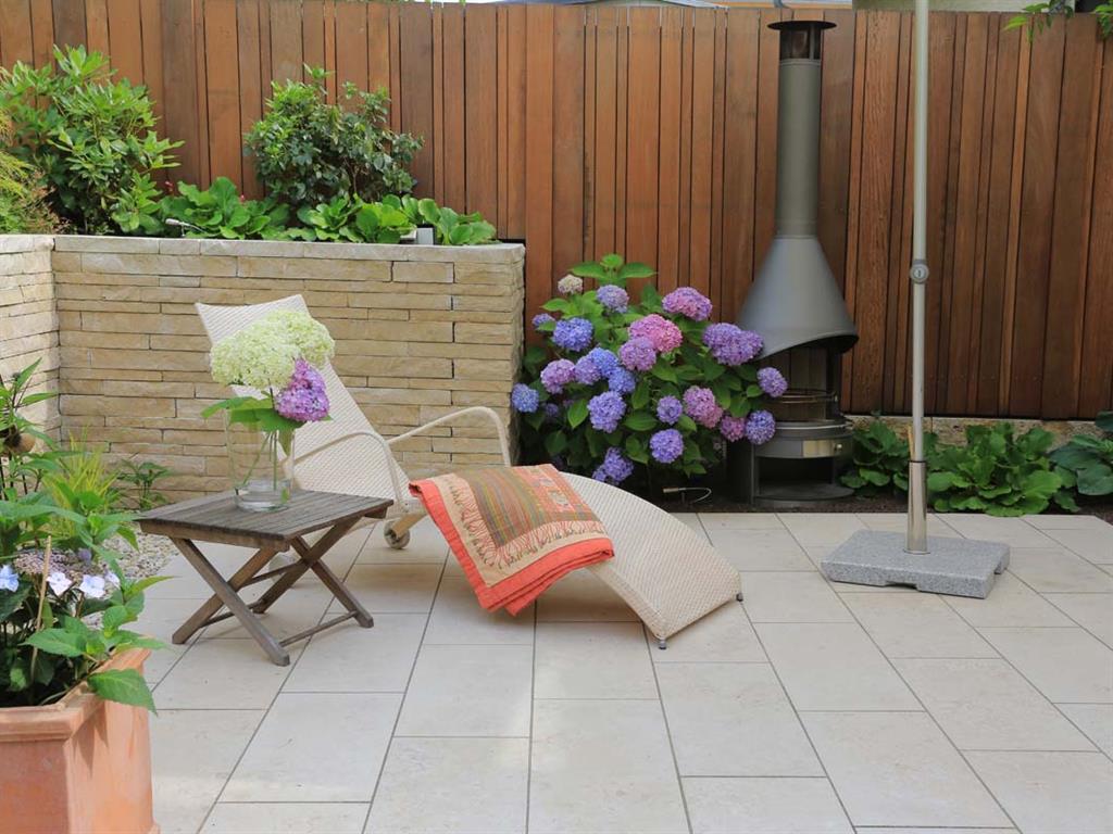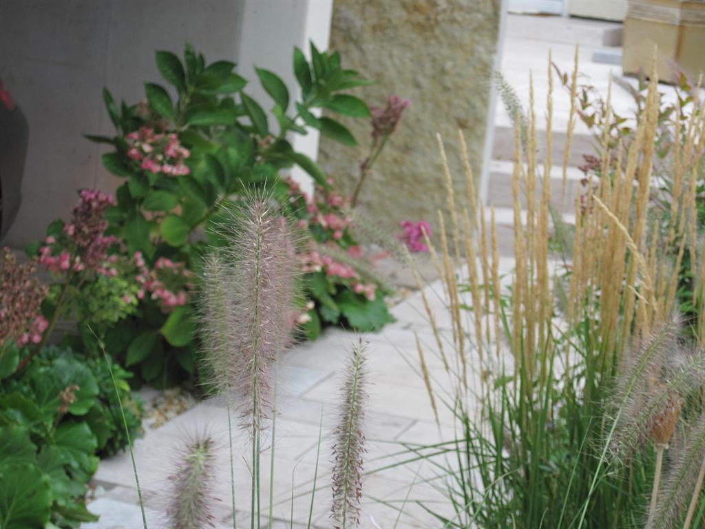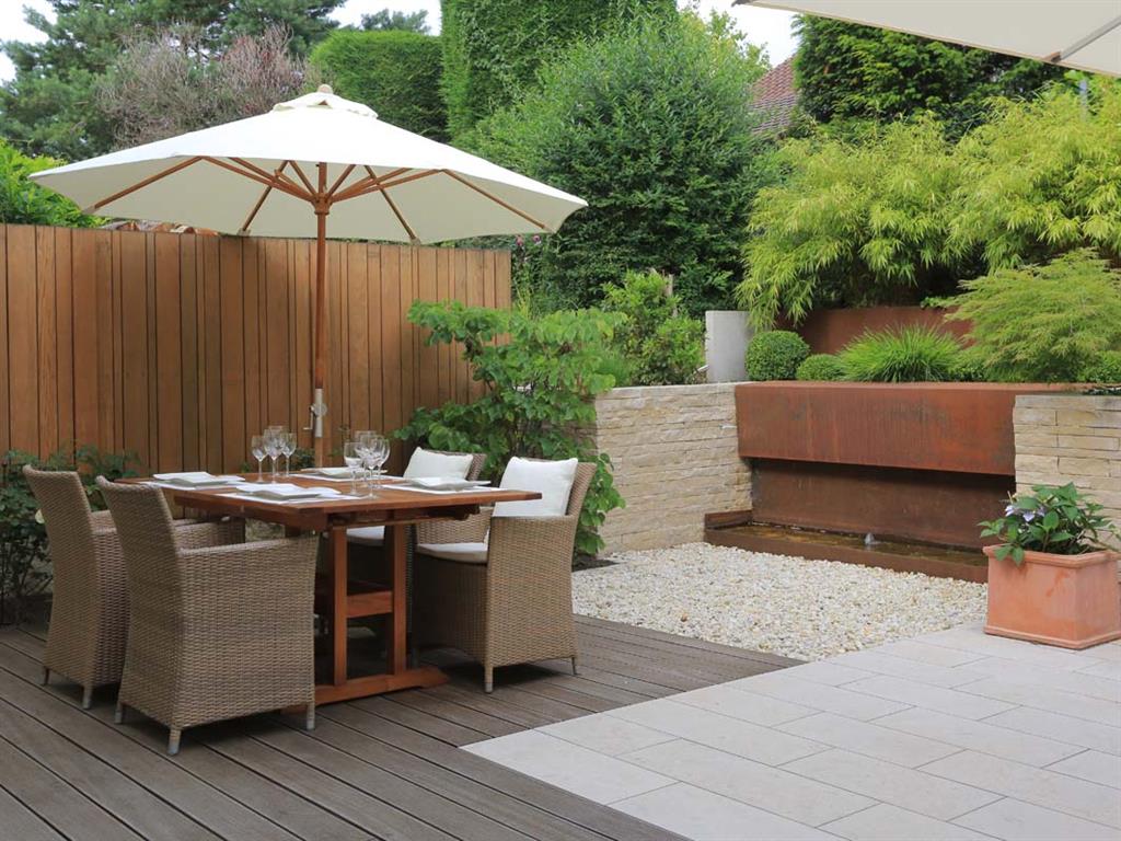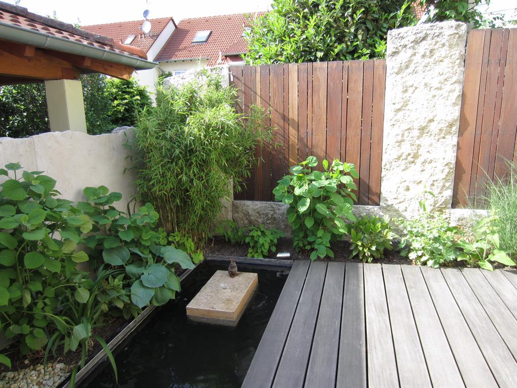 Vorgarten: Neugestaltung des Süd-orientierten Eingangsbereichs mit 2 Stellplätzen, Mülltonnenbereich, Holzterrasse und WasserspielHauptgarten: Neugestaltung des Hauptgartens mit größerer TerrassenflächeVerwendete Materialien: z. B. Jura-Boden- und Jura-Krustenplatten, Holzdeck und Sichtschutzelemente aus Hartholz, Cortenstahl, Schweizer Mauerwerk aus Jura-Mauersteinen