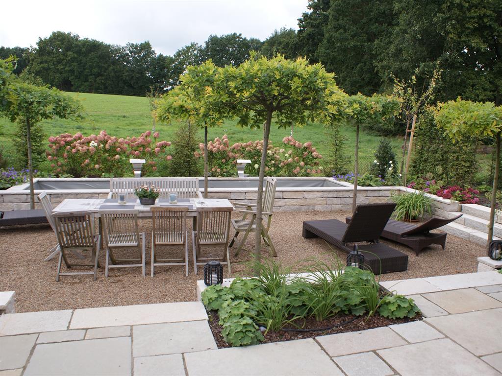 Dieser bestehende Garten wurde um ein großes Gartenzimmer erweitert. Zuerst war nur eine Remise angedacht, um dem neuen Garten auch einen überdachten Sitzplatz zu geben. Aber dann wurde es ein richtiges „Studio“ mit vorgelagertem Senkgarten, gradlinigem Wasserbecken mit zwei modernen Wasserspeiern. Dieser Garten ist mir vielen Hortensien bepflanzt und wird vom Hochsommer bis in den späten Herbst immer eine üppige Fülle ausstrahlen.