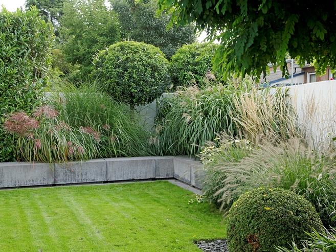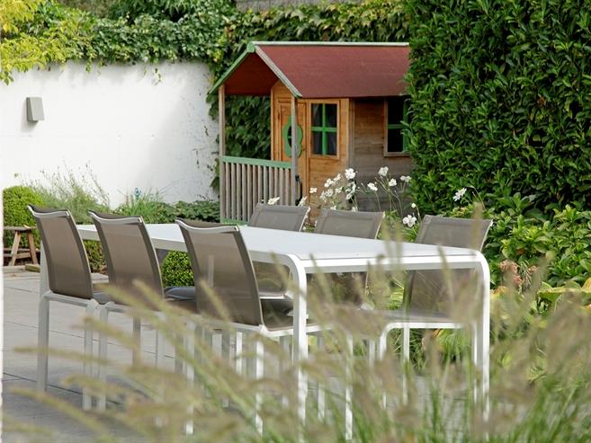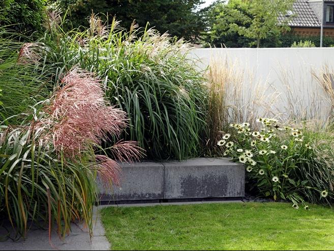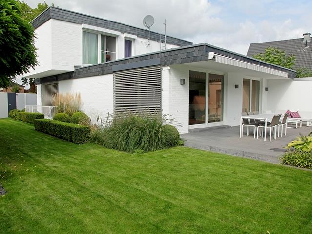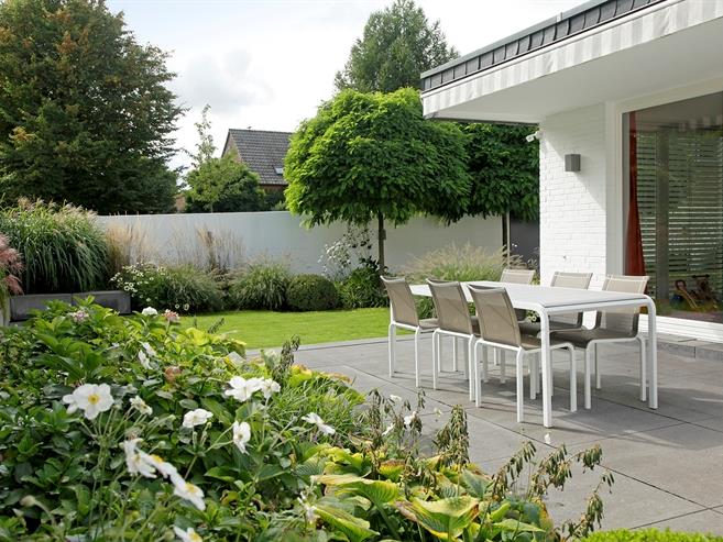 Unter dem Motto „Modern, repräsentativ, pflegeleicht und doch für die Familie gemütlich und entspannend“, wurde dieser Stadtgarten in den Farbtönen Grün und Weiß geplant. Der Farbton Weiß findet sich in der Hausfassade, den Blüten- und Blattfarben bis hin zu den Sitz- und Terrassenmöbeln wieder. Dem angepasst wurden die Steinbeläge, Sitzmauern und Gabionenfüllung in einem dezenten Grau gewählt.Neben den Farben Weiß und Grau bringt die abwechslungsreiche Bepflanzung eine Vielfalt an Grüntönen zum Vorschein. Das kräftige Grün der Buchskugeln geht ins saftige Grün von Funkien, Liriope und Lorbeerhecken über. Drei Kugelrobinien wachsen an der Längsseite des Grundstücks und geben Sichtschutz zu den Nachbarhäusern.