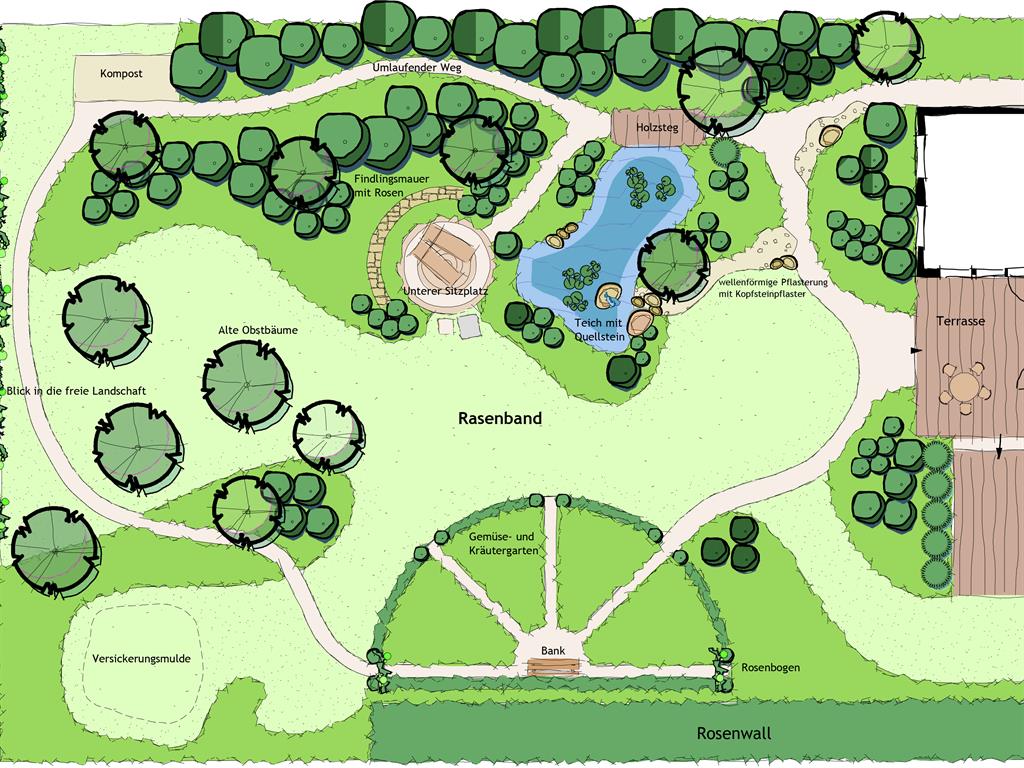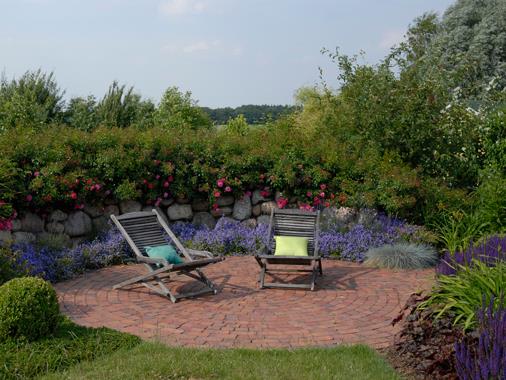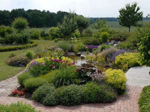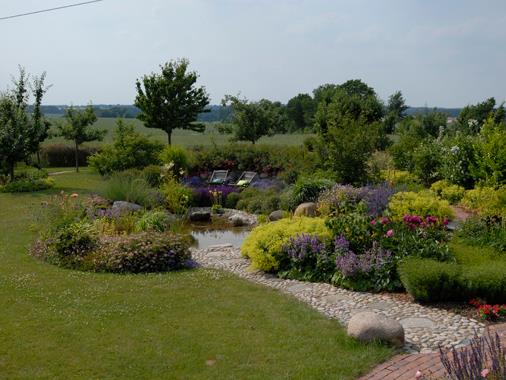 Mit Blick in die freie LandschaftDieser Garten - mit dem Blick in die leicht hügelige Landschaft - ist ein idyllischer Ort am Rande der Lüneburger Heide. Üppige Stauden, ein Gemüsegarten, Klinkerpflaster und runde Findlinge machen den Charme diese Gartens aus. Ein Teich mit Quellstein und ein sonniger Sitzplatz mit Rückblick zum Haus sind für seine Gartenbesitzer ein Ort der Ruheund Erholung.